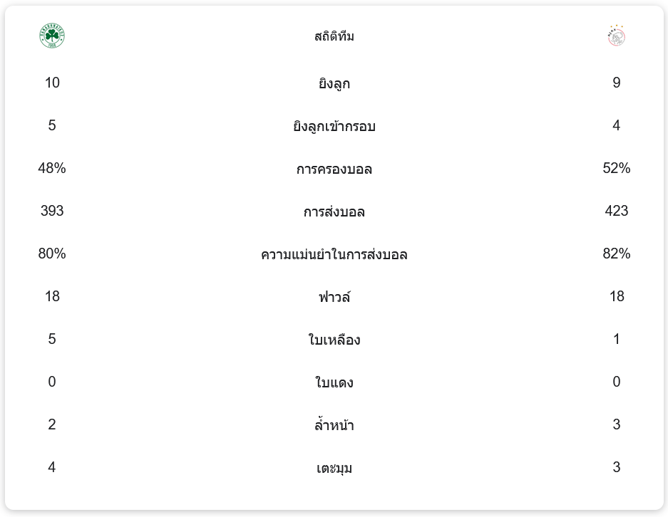 ด้านทีม อาแจกซ์ อัมสเตอร์ดัม มีการยิงทั้งหมด 9 ครั้ง ยิงเข้ากรอบ 4 ครั้ง ครองบอลได้ 52% การทำฟาวล์ทั้งหมด 18 ครั้ง ได้รับใบเหลือง 1 ใบ ไม่มีใบแดง ได้เตะมุม 3 ครั้ง และล้ำหน้า 3 ครั้ง