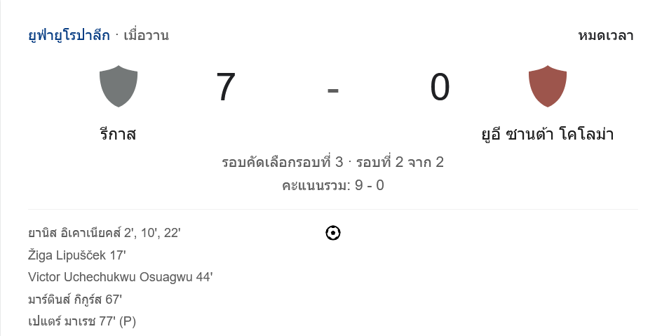การแข่งขันฟุตบอล ยูฟ่ายูโรปาลีก 2024 ระหว่าง ริกาสฟุทโบลา สโกลา และ ยูอี ซานต้า โคโลม่า จบลงด้วยชัยชนะที่น่าทึ่งของทีมเจ้าบ้าน ริกาสฟุทโบลา สโกลา ด้วยสกอร์ถล่มทลาย 7-0 ในการแข่งขันรอบคัดเลือกรอบที่ 3 นัดที่ 2 ทำให้ทีมผ่านเข้ารอบด้วยคะแนนรวม 9-0