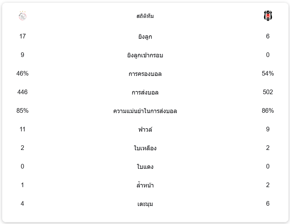 สถิติการแข่งขัน: อาแจกซ์ อัมสเตอร์ดัมสามารถสร้างโอกาสได้มากถึง 17 ครั้ง โดยยิงเข้ากรอบถึง 9 ครั้ง ขณะที่ เบซิคตัส มีโอกาสยิงเพียง 6 ครั้ง และไม่สามารถยิงเข้ากรอบได้เลย แม้ว่าการครองบอลจะอยู่ที่ 54% ให้กับเบซิคตัส แต่ความสามารถในการบุกและจบสกอร์ของอาแจกซ์เหนือกว่าอย่างชัดเจน ความแม่นยำในการส่งบอลของทั้งสองทีมใกล้เคียงกัน อาแจกซ์ส่งบอล 446 ครั้ง ขณะที่เบซิคตัสส่งบอล 502 ครั้ง
