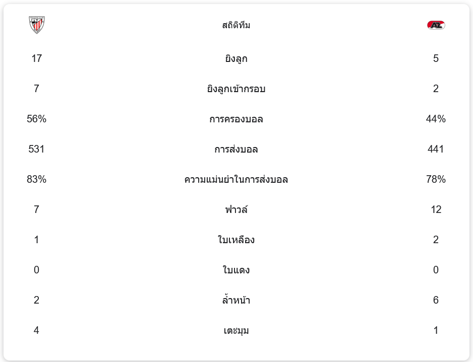 เกมนี้ แอธเลติก บิลเบา ครองเกมได้อย่างชัดเจน โดยมีการครองบอลถึง 56% และทำการส่งบอลทั้งหมด 531 ครั้ง ด้วยความแม่นยำ 83% ขณะที่ อาแซด อัลค์มาร์ ครองบอลได้ 44% และมีการส่งบอล 441 ครั้ง ด้วยความแม่นยำ 78% เจ้าบ้านบิลเบายิงทั้งหมด 17 ครั้ง เข้ากรอบ 7 ครั้ง ขณะที่อาแซดยิงเพียง 5 ครั้ง และเข้ากรอบ 2 ครั้ง นอกจากนี้ยังมีการฟาวล์รวมกันถึง 19 ครั้ง ใบเหลืองจากฝั่งอาแซด 2 ใบ และฝั่งบิลเบา 1 ใบ