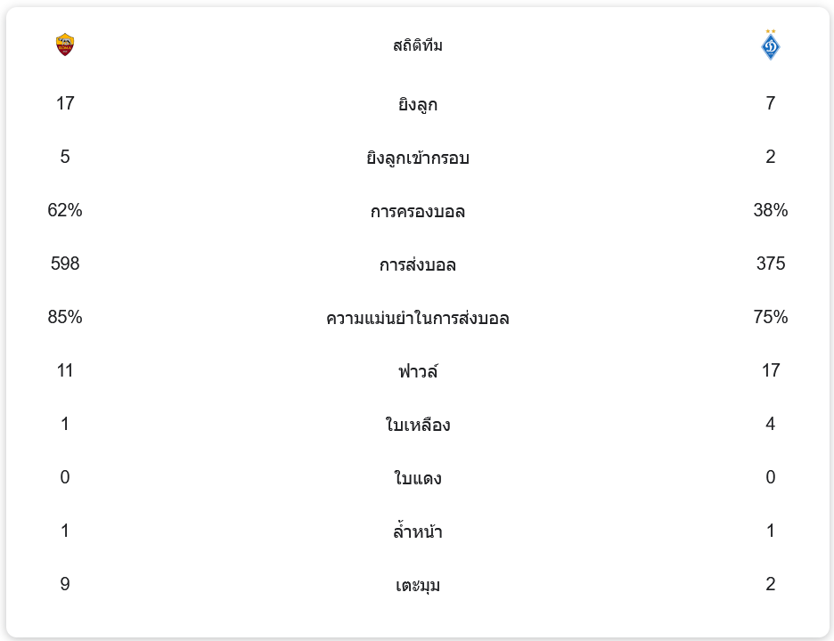 โรม่าเหนือกว่าดินาโม เคียฟในแทบทุกด้าน ด้วยการครองบอล 62% และการยิงทั้งหมด 17 ครั้ง เมื่อเทียบกับดินาโม เคียฟที่มีเพียง 7 ครั้ง นอกจากนี้ โรม่ายังมีการส่งบอลที่แม่นยำกว่าด้วยเปอร์เซ็นต์การผ่านบอลที่สูงถึง 85% การควบคุมจังหวะเกมได้อย่างชัดเจน ทำให้คู่แข่งมีโอกาสโต้กลับน้อย