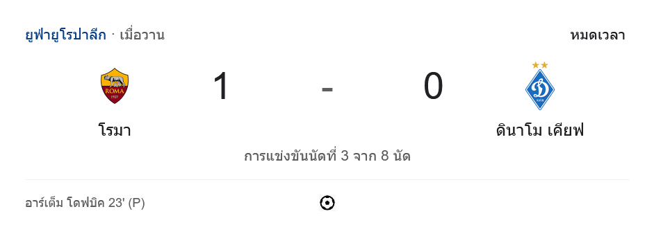 การแข่งขันฟุตบอล ยูฟ่ายูโรปาลีก 2024 นัดที่ 3 ของรอบแบ่งกลุ่ม ระหว่าง เอเอส โรม่า และ ดินาโม เคียฟ จบลงด้วยสกอร์ 1-0 โรม่าเก็บชัยชนะครั้งนี้ได้จากลูกจุดโทษในนาทีที่ 23 จาก อาร์เต็ม โดฟบิค ส่งผลให้ทีมผ่านเข้ารอบอย่างมั่นใจ และยึดตำแหน่งในกลุ่มได้แน่นหนายิ่งขึ้น