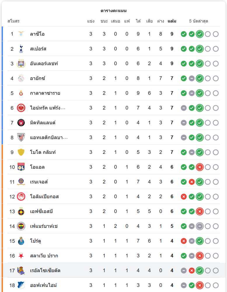 ชัยชนะครั้งนี้ทำให้ เรอัล โซเซียดาด เก็บเพิ่มเป็น 4 คะแนน ขึ้นมาอยู่อันดับที่ 17 ในขณะที่ มัคคาบี้ เทลอาวีฟ ยังคงรั้งอันดับที่ 34 ของตารางคะแนน โดยยังไม่มีแต้มจากการลงเล่น 3 นัด
