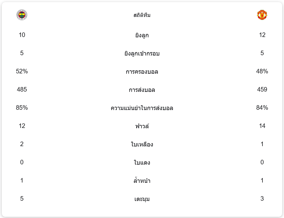 ในแมตช์นี้ เฟเนร์บาห์เช่ ครองบอลได้มากกว่าด้วยเปอร์เซ็นต์ 52% ขณะที่ แมนเชสเตอร์ ยูไนเต็ด ครองบอลเพียง 48% โอกาสยิงของทั้งสองทีมค่อนข้างใกล้เคียงกัน โดยเฟเนร์บาห์เช่ยิง 10 ครั้ง และแมนเชสเตอร์ ยูไนเต็ดมีโอกาสยิง 12 ครั้ง ทั้งคู่มีการยิงเข้ากรอบประตูเท่ากันที่ 5 ครั้ง แต่ไม่สามารถเปลี่ยนโอกาสเป็นประตูชัยได้