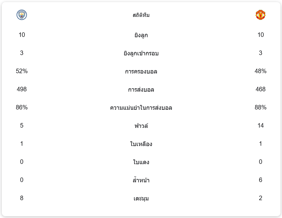 ทั้งสองทีมยิงได้เท่ากันที่ 10 ครั้ง โดยเข้ากรอบ 3 ครั้งเท่ากัน การครองบอลซิตี้เหนือกว่าเล็กน้อยที่ 52% ส่วนยูไนเต็ดอยู่ที่ 48% แต่ทีมเยือนทำได้ดีกว่าในจังหวะจบสกอร์และการสวนกลับ