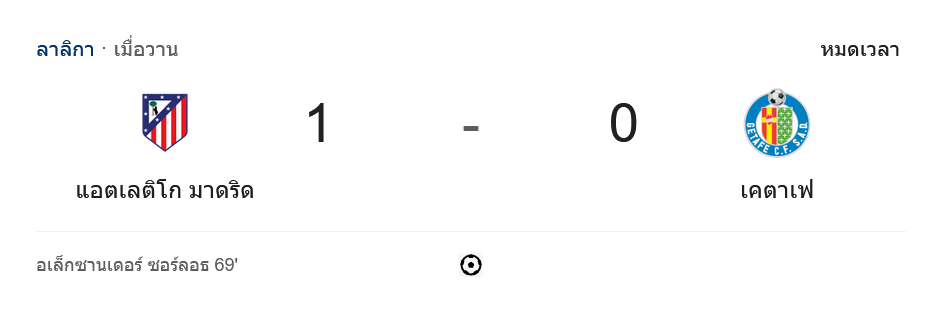 เจ้าบ้านยังคงเดินหน้าบุกอย่างหนัก ก่อนมาปลดล็อกประตูสำคัญในนาทีที่ 69 จากจังหวะที่ นาฮูเอล โมลิน่า แอสซิสต์ให้ อเล็กซานเดอร์ ซอร์ลอธ ซัดเข้าไปอย่างเฉียบคม พาทีมขึ้นนำ 1-0 หลังจากนั้นเกมกลับมาดุเดือด แต่เกตาเฟ่ไม่สามารถทวงประตูคืนได้ จบเกม แอตเลติโก มาดริด ชนะ 1-0 พร้อมเก็บชัยชนะในบ้านได้สำเร็จ