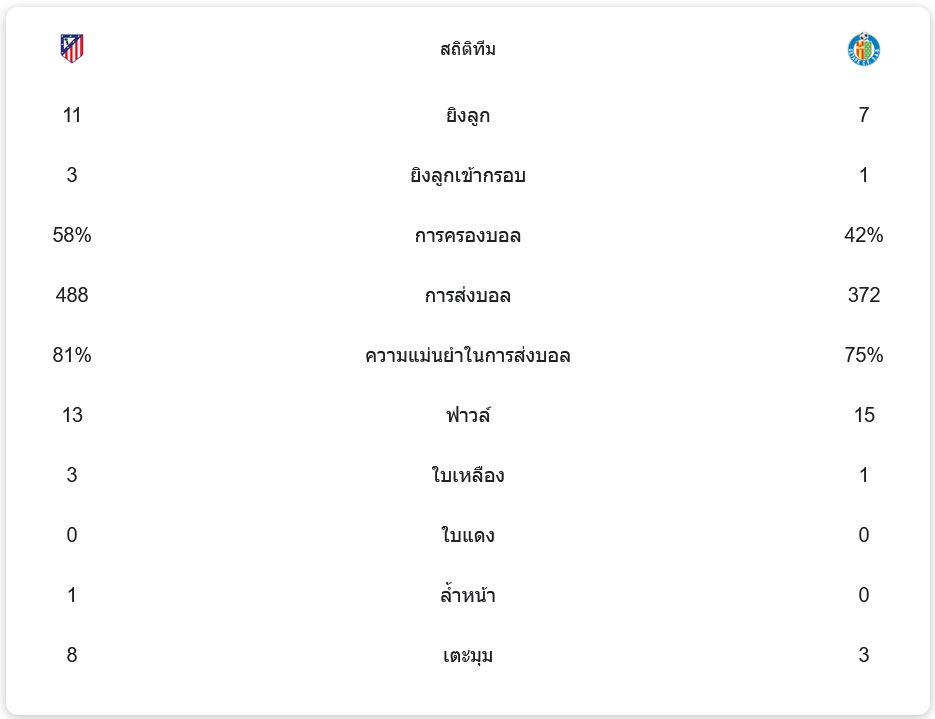 แอตเลติโก มาดริด ครองบอลเหนือกว่า 58% ยิงทั้งหมด 11 ครั้ง เข้ากรอบ 3 ครั้ง ขณะที่เกตาเฟ่มีโอกาสยิง 7 ครั้ง แต่เข้ากรอบเพียง 1 ครั้งเท่านั้น ด้านการจ่ายบอล ตราหมีทำได้ 488 ครั้งด้วยความแม่นยำ 81% ส่วนทีมเยือนส่งบอล 372 ครั้ง ความแม่นยำ 75%