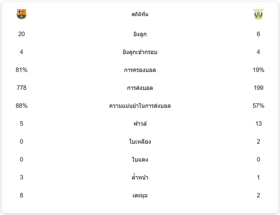 - การยิง: บาร์เซโลน่า 20 ครั้ง | เลกาเนส 6 ครั้ง