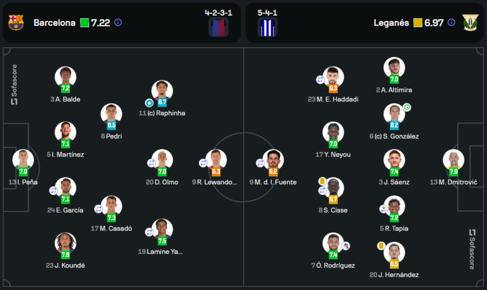 แม้ทีมจะพ่ายแพ้ แต่ ราฟินญ่า ยังคงโดดเด่นด้วยการสร้างสรรค์โอกาสหลายครั้ง พร้อมกับสถิติการส่งบอลแม่นยำสูงถึง 88% และการยิงเข้ากรอบที่ทำให้แนวรับเลกาเนสต้องออกแรงเหนื่อย