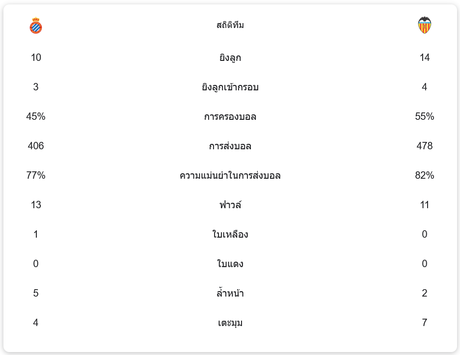 บาเลนเซียครองบอลได้ 55% และมีโอกาสยิงทั้งหมด 14 ครั้ง โดยเข้ากรอบ 4 ครั้ง ส่วนเอสปันญ่อลมีโอกาสยิง 10 ครั้ง และเข้ากรอบ 3 ครั้ง ความแม่นยำในการจ่ายบอลของบาเลนเซียสูงถึง 82% เทียบกับ 77% ของเอสปันญ่อล