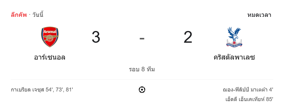 จาก : ผลบอลสด อีเอฟแอลคัพ 2024 ระหว่าง อาร์เซนอล 3-2 คริสตัล พาเลซ วันนี้ 19/12/67 – บ้านกีฬา