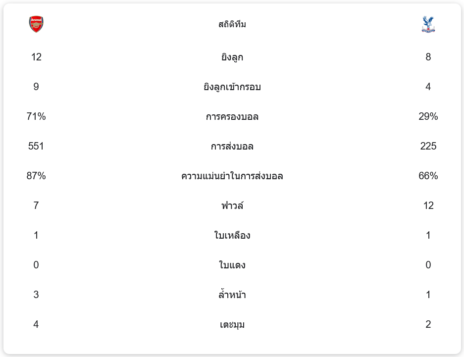 อาร์เซนอลแสดงให้เห็นถึงความเหนือกว่าด้วยโอกาสยิงทั้งหมด 12 ครั้ง และยิงเข้ากรอบ 9 ครั้ง ขณะที่คริสตัล พาเลซมีโอกาสยิง 8 ครั้ง และเข้ากรอบเพียง 4 ครั้ง การครองบอลของอาร์เซนอลสูงถึง 71% และความแม่นยำในการจ่ายบอลที่ 87% ทำให้พวกเขาคุมเกมได้ดีกว่า