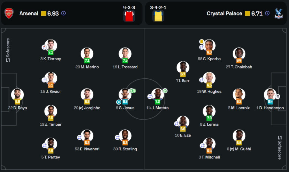อาร์เซนอลมาในแผน 4-3-3 ที่เน้นการบุกด้วยปีกทั้งสองข้าง โดยเฉพาะซาก้าและทรอสซาร์ดที่สร้างความกดดันให้แนวรับของพาเลซอย่างต่อเนื่อง ด้านคริสตัล พาเลซ ใช้แผน 3-4-2-1 เน้นการสวนกลับเร็วและการวางบอลยาว อาร์เซนอลมีการครองบอลถึง 71% เทียบกับพาเลซที่มีเพียง 29% แต่จังหวะสวนกลับของพาเลซยังอันตรายตลอดเกม
