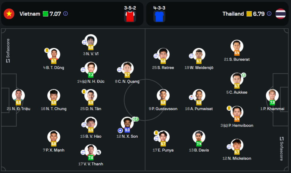 กัปตันทีมเวียดนามโชว์ฟอร์มอย่างยอดเยี่ยม ยิงสองประตูสำคัญให้ทีมเก็บชัยชนะ พร้อมแสดงความเป็นผู้นำในสนามด้วยคะแนนสูงสุด 9.0