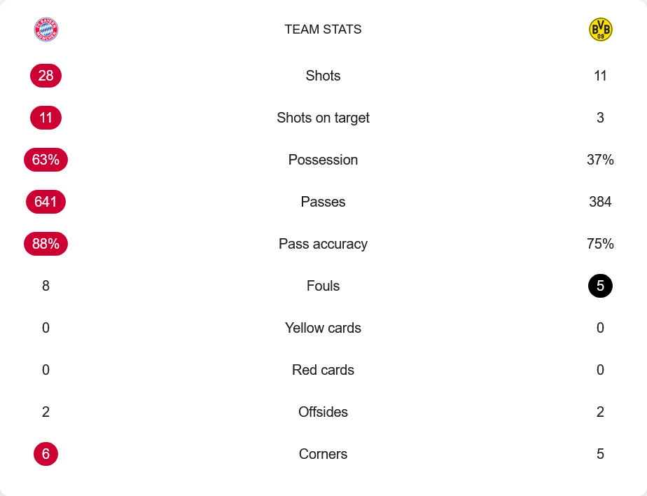 ตลอด 90 นาที บาเยิร์นครองบอลมากถึง 63% สร้างโอกาสยิงได้ถึง 28 ครั้ง และยิงเข้ากรอบถึง 11 ครั้ง ส่วนดอร์ทมุนด์มีโอกาสยิงเพียง 11 ครั้ง เข้ากรอบ 3 ครั้งเท่านั้น แต่กลับทำได้ถึง 2 ประตูในจังหวะสำคัญ การผ่านบอลของเจ้าถิ่นมากถึง 641 ครั้ง ความแม่นยำ 88% เทียบกับดอร์ทมุนด์ที่ผ่านบอลเพียง 384 ครั้ง ความแม่นยำอยู่ที่ 75% ฟาวล์รวมทั้งหมดมีเพียง 13 ครั้ง แบ่งเป็นบาเยิร์น 8 ครั้ง ดอร์ทมุนด์ 5 ครั้ง ไม่มีใบเหลืองใบแดงเกิดขึ้นในเกมนี้ บาเยิร์นได้เตะมุม 6 ครั้ง ขณะที่ทีมเยือนได้ 5 ครั้ง ถือเป็นเกมที่มีคุณภาพสูงทั้งในด้านแท็คติกและความเข้มข้นของเกม