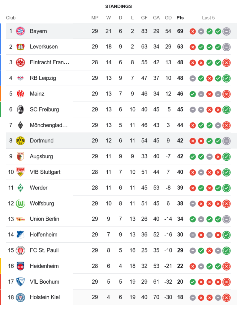 การเสมอในเกมนี้ทำให้ บาเยิร์น มิวนิค เก็บเพิ่มเป็น 69 แต้มจาก 29 นัด ยังนำเป็นจ่าฝูง บุนเดสลีกา 2025 โดยมีคะแนนห่างจากเลเวอร์คูเซ่น 6 แต้ม ขณะที่ดอร์ทมุนด์ขยับเพิ่มเป็น 42 คะแนน รั้งอันดับ 8 เท่ากับเอาก์สบวร์กแต่ผลต่างประตูได้เสียดีกว่า ทำให้ยังมีลุ้นแย่งพื้นที่ยุโรปหากเก็บชัยได้ต่อเนื่องในเกมถัดไป