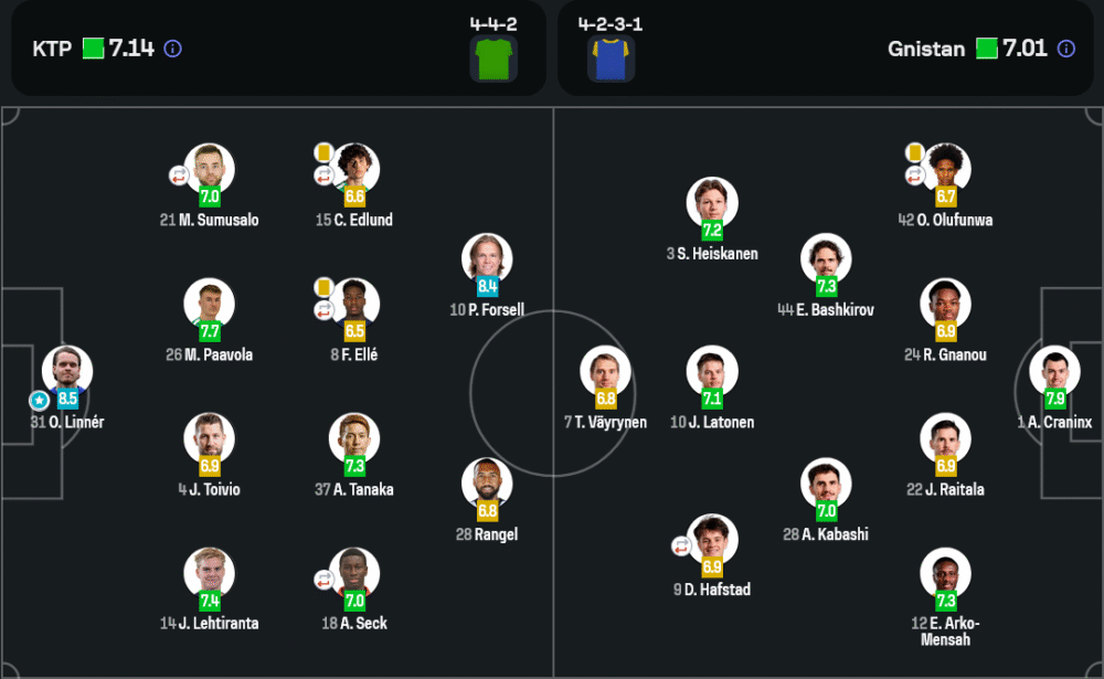 กองกลาง: M. Paavola (7.7), F. Ellé (6.5), M. Sumusalo (7.0), C. Edlund (6.6)