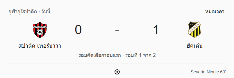 ผลบอล คู่นี้จบลงที่ ฮัคเค่น บุกเฉือนชนะ สปาร์ตัก เทอร์นาว่า 1-0 เก็บอเวย์โกล์สำคัญ พร้อมความได้เปรียบก่อนกลับไปเล่นเลกสองที่สวีเดน ส่วนเจ้าถิ่นต้องลุยเต็มที่ในนัดถัดไป หากหวังต่อยอดในถ้วยยุโรปปีนี้