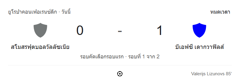 - นาทีที่ 85: GOAL! Valerijs Lizunovs หลุดเข้ากรอบก่อนซัดเสียบเสาแรกให้เดากาวพิลส์นำ 0-1
