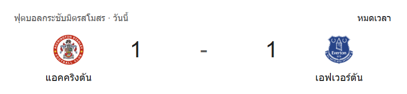 ฟุตบอลกระชับมิตรสโมสรเมื่อคืนนี้ที่ Crown Ground กลายเป็นสนามประลองแห่งศักดิ์ศรี เมื่อ “แอคคริงตัน สแตนลี่ย์” เปิดบ้านเสมอ “เอฟเวอร์ตัน” ไปแบบสุดระทึก 1-1 โดย บ้านกีฬา เกาะติด ผลบอลสด ตลอดทั้งเกม บอกเลยว่าสนามไฟลุกตั้งแต่เสียงนกหวีดเริ่มเกมจนจบ 90 นาที!