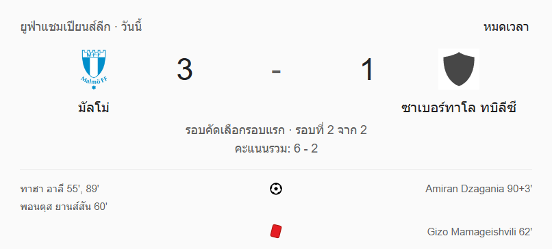ผลบอลสด ยูฟ่าแชมเปียนส์ลีก รอบคัดเลือก รอบแรก เลกสอง ระหว่าง มัลโม่ เอฟเอฟ vs เอฟซี ซาเบอร์ทาโล ทบิลีซี วันนี้ 16/7/68 ดูบอลย้อนหลัง คลิปไฮไลท์ ดูบอล ยูฟ่าแชมเปียนส์ลีก รอบคัดเลือก รอบแรก เลกสอง