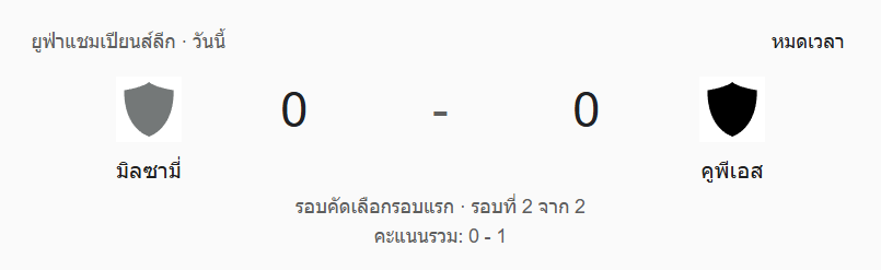 ผลบอลสด ยูฟ่าแชมเปียนส์ลีก รอบคัดเลือก รอบแรก เลกสอง ระหว่าง เอฟซี มิลซามี่ vs คูพีเอส วันนี้ 16/7/68 ดูบอลย้อนหลัง คลิปไฮไลท์ ดูบอล ยูฟ่าแชมเปียนส์ลีก รอบคัดเลือก รอบแรก เลกสอง