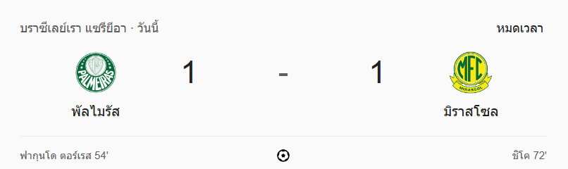 - นาทีที่ 98: จบการแข่งขัน! พัลไมรัส เสมอ มิราสโซล 1-1 แบ่งกันไปทีมละแต้ม