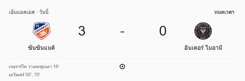 ซินซินเนติพิสูจน์ความเหนือชั้นให้เห็นอีกครั้งในบ้านตัวเอง โดยเฉพาะ “เอวานเดอร์” ที่ซัดเบิ้ลคนเดียวสองประตู ขณะที่อินเตอร์ ไมอามี เกมนี้แผ่วจริง แม้มีดาวดังอย่างลิโอเนล เมสซี กับหลุยส์ ซัวเรซก็ไม่สามารถเปลี่ยนโอกาสเป็นประตูได้ จบด้วยผลบอลสดสุดช็อก 3-0 อินเตอร์ ไมอามี ต้องกลับบ้านมือเปล่า