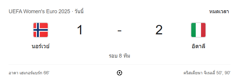 รายงานการแข่งขัน: นอร์เวย์ 1-2 อิตาลี (UEFA Women’s Euro 2025 รอบ 8 ทีม)