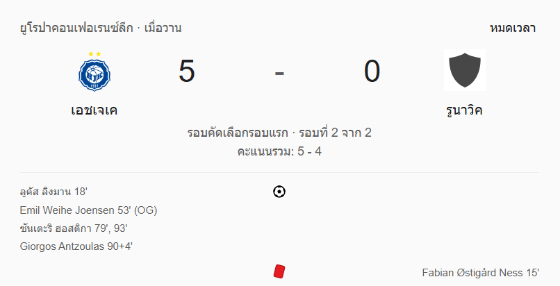 - หมดเวลา: เอชเจเค เฮลซิงกิ 5-0 รูนาวิค (รวมสองนัด HJK พลิกเข้ารอบด้วยสกอร์ 5-4)