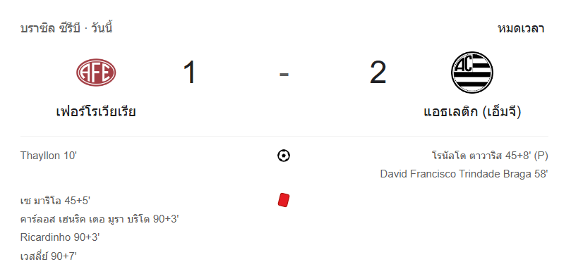 ผลบอลสด คัมปิโอนาโต บราซิเลียโร ซีรีบี ระหว่าง เฟอร์โรเวียเรีย เอสพี 1-2 แอธเลติก เอ็มจี วันนี้ 19/7/68