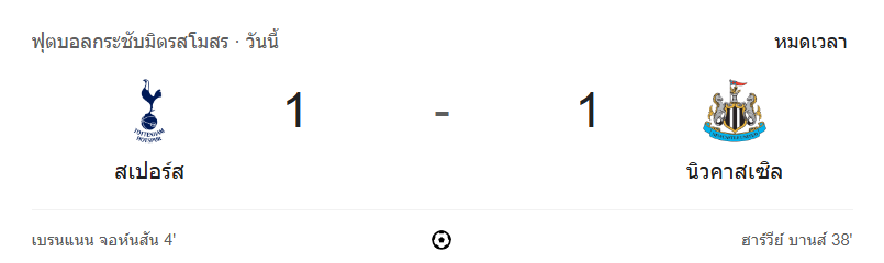 - หมดเวลาการแข่งขัน: สเปอร์ส 1-1 นิวคาสเซิล แบ่งกันไปทีมละแต้มในเกมที่สนุกและเปิดหน้าแลกตลอดทั้งสองครึ่ง