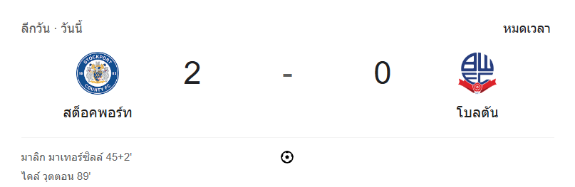 • หมดเวลา: สต็อคพอร์ท 2-0 โบลตัน เจ้าบ้านเก็บ 3 คะแนนในบ้านแบบสมบูรณ์แบบ ประตูของ Malik Mothersille และ Kyle Wootton พา Stockport ขึ้นไปรั้งกลุ่มบนของตาราง โบลตันต้องกลับไปแก้เกมรุกที่ขาดความเฉียบคม