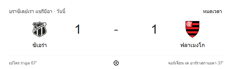 ผลบอล กังเปโอนาตู บราซีเลย์รู แซรียีอา ซิเอร่า เปิดบ้านไล่เจ๊า ฟลาเมงโก สุดมันส์ 1-1!