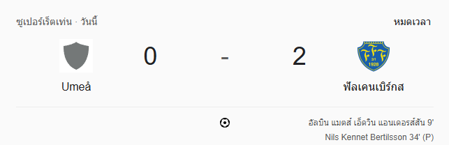 - ทดเวลาครึ่งแรก: Vikgren (Umeå) ได้ลองยิงฟรีคิกแต่ก็ยังไม่ผ่านมือ Andersson
