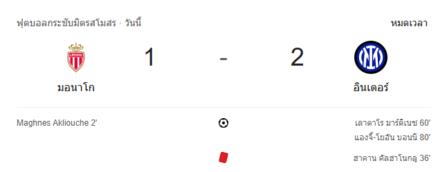 - หมดเวลา: อินเตอร์ มิลาน บุกชนะ โมนาโก 2-1 หลังจากโดนนำก่อนตั้งแต่ต้นเกม แต่ใช้เกมสวนกลับและความเฉียบคมปิดจ็อบสำเร็จ