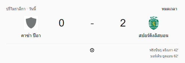 - หมดเวลา: คาซ่า เปีย 0-2 สปอร์ติ้ง ลิสบอน