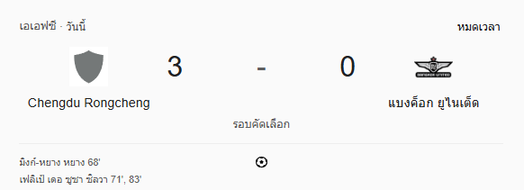 - ช่วงท้ายเกม: แบงค็อกพยายามเปิดเกมสู้ แต่ก็ไม่สามารถเจาะแนวรับเฉิงตูได้ จบ 90 นาที + ช่วงทดเวลา เฉิงตู หรงเฉิง เอฟซี เปิดบ้านเอาชนะ ทรู แบงค็อก ยูไนเต็ด ไปอย่างเด็ดขาด 3-0 ผ่านเข้าสู่รอบถัดไปของ เอเอฟซี แชมเปียนส์ ลีก อีลิท ส่วนแข้งเทพต้องไปลุยศึก เอเอฟซี แชมเปียนส์ ลีก 2