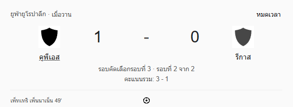 - หมดเวลา: คูพีเอส ชนะ รีกาส 1-0 ผ่านเข้ารอบด้วยสกอร์รวม 3-1