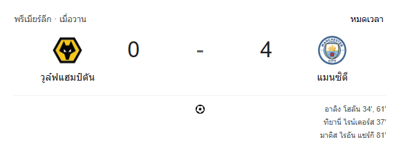 - หมดเวลา: วูล์ฟแฮมป์ตัน 0-4 แมนเชสเตอร์ ซิตี้ แข้งเรือใบโชว์ฟอร์มดุ เก็บสามแต้มแบบไม่เสียประตู