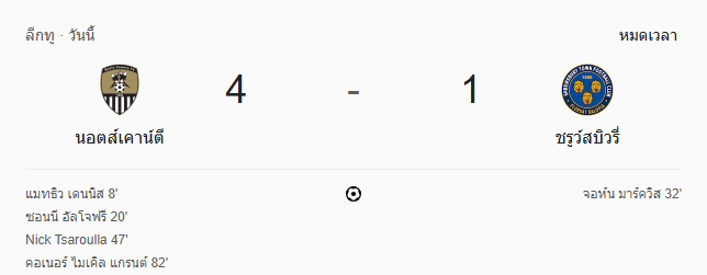 • นาทีที่ 47 — GOAL! น็อตส์หนี 3–1 Nick Tsaroulla กดด้วยขวาฝั่งซ้ายพุ่งเสียบสามเหลี่ยมคมกริบ แฟนเจ้าบ้านเฮสนั่น