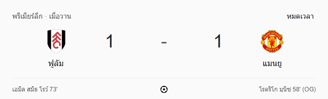 แมนฯ ยูไนเต็ดมีโอกาสปิดจบตั้งแต่ครึ่งแรกจากจุดโทษของ บรูโน่ แต่ยิงหลุดกรอบ ทำให้เกมเปิดให้ฟูแล่มกลับมาได้ในครึ่งหลัง แม้ผีแดงจะได้ของขวัญเป็น OG ของมูนิซ ทว่าเปลี่ยนโมเมนตัมได้ไม่นาน เพราะการเปลี่ยนตัวของเจ้าบ้านได้ผล สมิธ โรว์ ลงมายิงกู้แต้มทันที แบ่งแต้มกันอย่างยุติธรรมในเกมที่เข้มข้นทั้งแท็กติกและอารมณ์เกม