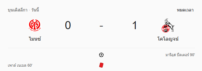 บ้านกีฬาเก็บ ผลบอลสด คู่เดือดบุนเดสลีกา: เอฟเอสเฟา ไมนซ์ 05 พ่ายคาบ้านให้โคโลญจน์ 0-1 ประตูชัยมาในช่วงนาทีสุดท้ายจากลูกโหม่งของ มาริอุส บูลเตอร์ เกมนี้เจ้าถิ่นเหลือ 10 คนตั้งแต่นาที 60 กลายเป็นจุดหักเหสำคัญของแมตช์