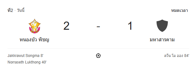เจ้าบ้านคมกว่าในจังหวะจบสกอร์ตั้งแต่ครึ่งแรก แม้มหาสารคามจะฮึดไล่ช่วงท้ายด้วยประตูของ Lwin Moe Aung แต่ไล่ไม่ทัน ทำให้สามคะแนนสำคัญตกเป็นของหนองบัวพิชญตามสกอร์ 2-1
