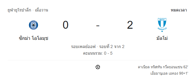 - หมดเวลา: ซิกม่า โอโลมูช 0-2 มัลโม่