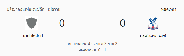 ผลการแข่งขันยูฟ่า คอนเฟอเรนซ์ลีก รอบเพลย์ออฟ คืนเดือดที่ Fredrikstad Stadium — ผลบอลสด จบที่เสมอแบบไร้สกอร์ 0-0 ระหว่างเจ้าบ้าน เฟรดริกซ์สตรัด กับผู้มาเยือนจากอังกฤษ คริสตัล พาเลซ แต่เป็นทีมเยือนที่ผ่านเข้ารอบด้วยสกอร์รวม 1-0 จากชัยชนะในนัดแรก