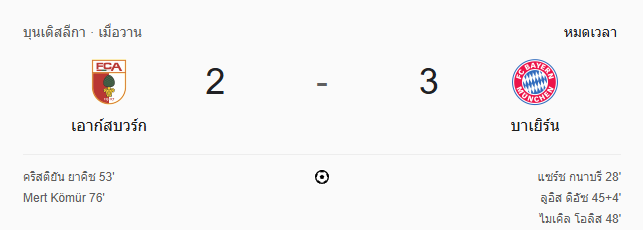 - นาทีที่ 103: หมดเวลาการแข่งขัน: เอาก์สบวร์ก 2-3 บาเยิร์น มิวนิค