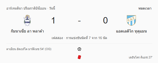 - หมดเวลา: 🎉 กิมนาเซีย ลา พลาต้า เปิดบ้านเฉือนชนะ แอตเลติโก ตูคูมาน 1-0 จากประตูที่เกิดจากความผิดพลาดของแนวรับทีมเยือน
