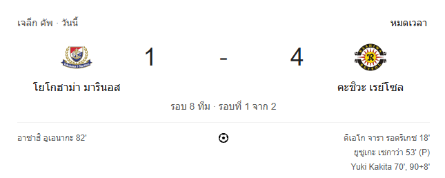 - จบเกม: โยโกฮาม่า มารินอส พ่ายคารัง 1-4 ให้กับคาชิว่า เรย์โซล โดย ยูกิ คาคิตะ ทำแฮตทริกพาทีมเก็บชัยนอกบ้านได้อย่างยอดเยี่ยม พร้อมตุนความได้เปรียบในเลกแรกของรอบ 8 ทีมสุดท้ายในศึกเจลีก คัพ