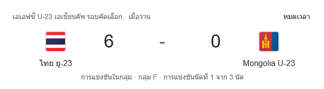 หมดเวลาการแข่งขัน ทีมชาติไทย U23 ไล่ถล่ม มองโกเลีย U23 6-0 เก็บสามแต้มแรกอย่างสวยหรู พร้อมผงาดขึ้นจ่าฝูงกลุ่ม F ด้วยผลต่างประตูได้เสียที่เหนือกว่าเลบานอน ซึ่งชนะมาเลเซีย 1-0 ในอีกคู่ของกลุ่มเดียวกัน